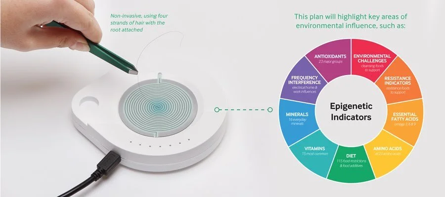 The process takes about 10 minutes in which four hair follicles from the back of your neck or eyebrows are scanned through our software generating an epigenetic mapping report to improve your health via a 90 day plan that incorporates suggested diet, environmental, and lifestyle alterations tailored to your unique needs. Results are received within 20 minutes after transmission of the sample.